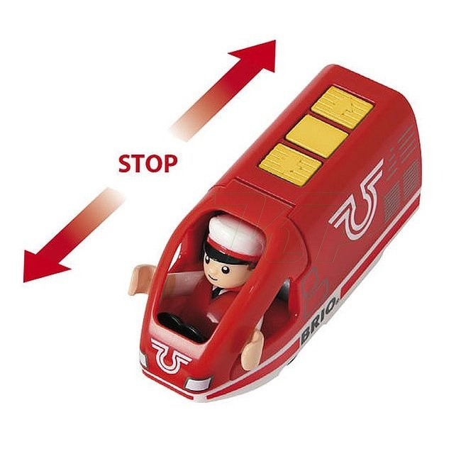 BRIO Dobíjací osobný vlak po nabití sa dá ovládať žltým tlačidlom hore, ide dopredu alebo dozadu