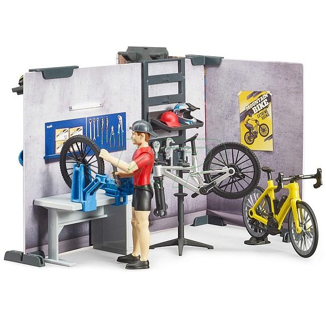 Bruder Bworld Predajňa a servis bicyklov príslušenstvo zadná stena, police, držiaky, pracovný stôl so zverákom a centrovaním, stojan na bicykle, náradie, stôl s pokladňou, 2 bicykle, montážna figúrka, rozmer: 11 cm