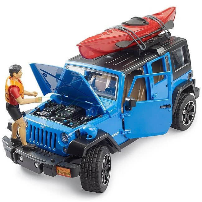 Bruder Jeep Wrangler Rubicon Unlimited s kajakom a figúrka terénne auto s otváracími dverami, strechou motorového priestoru a kufrom, odpružená predná náprava, rezervné koleso, kajak na kufri