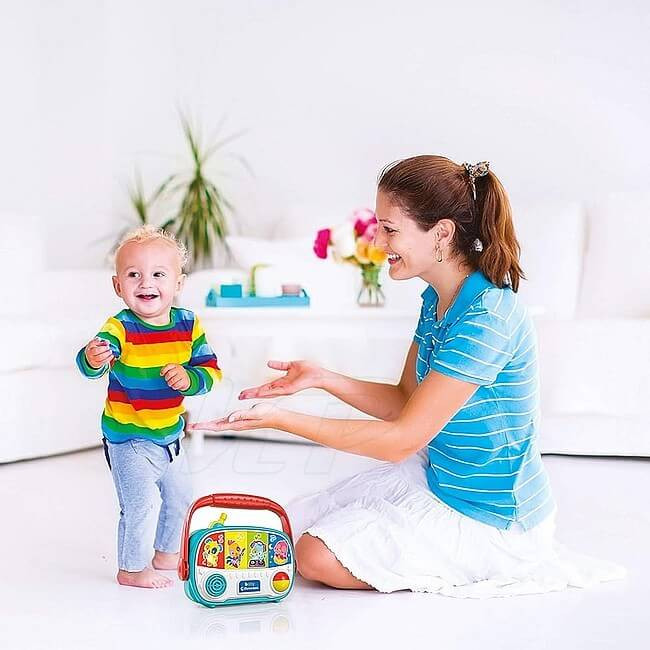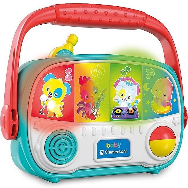 Hudobné rádio pre bábätká! Clementoni Detské rádio prenosná hračka pre bábätká so zvukmi zvierat, hudbou, svetlami a rotujúcou loptičkou na rozvoj kognitívnych schopností a jemnej motoriky