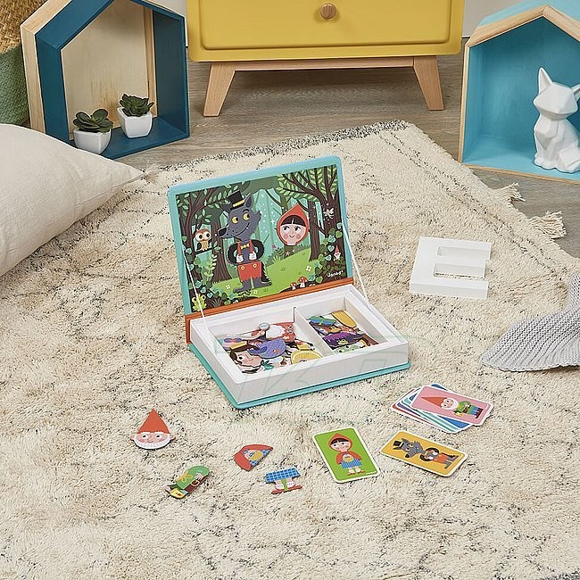 Vytvorte si obrázok o rozprávky! Janod magnetická kniha rozprávky kniha s otvárateľnou obálkou, v ktorej nájdete rôzne magnetické kartónové listy, z ktorých musíte zostaviť obrázky na karte