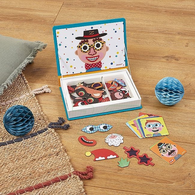 Janod magnetická kniha zábavné tváre chlapci obsah: 12 kariet s figúrkami, 70 magnetický kartonový list