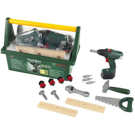 Klein Bosch Mini truhla na náradie obsah: skrutkovač so 4 rôznymi hlavami, kladivo, píla, nastaviteľný kľúč, skrutky, príslušenstvo