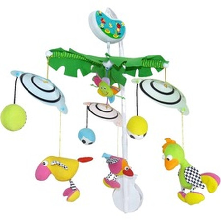 Kolotoč spievajúcich vtákov jeho farby a vzory rozvíjajú zrak, sluch, koordináciu ruka-oko a kognitívne schopnosti bábätka