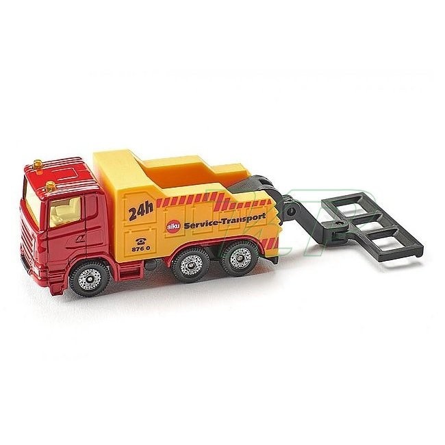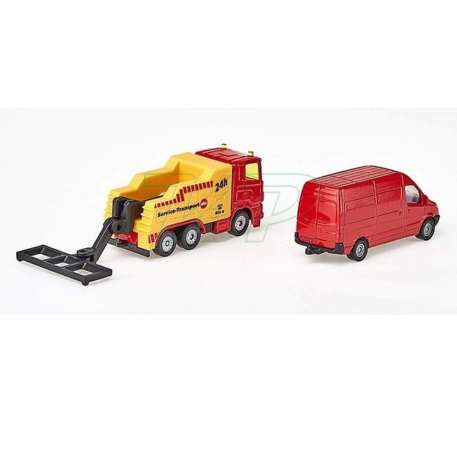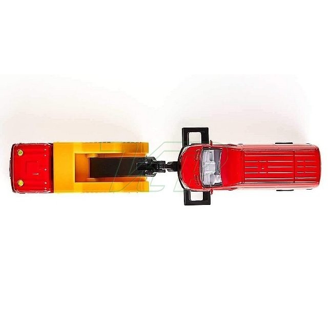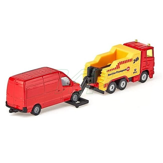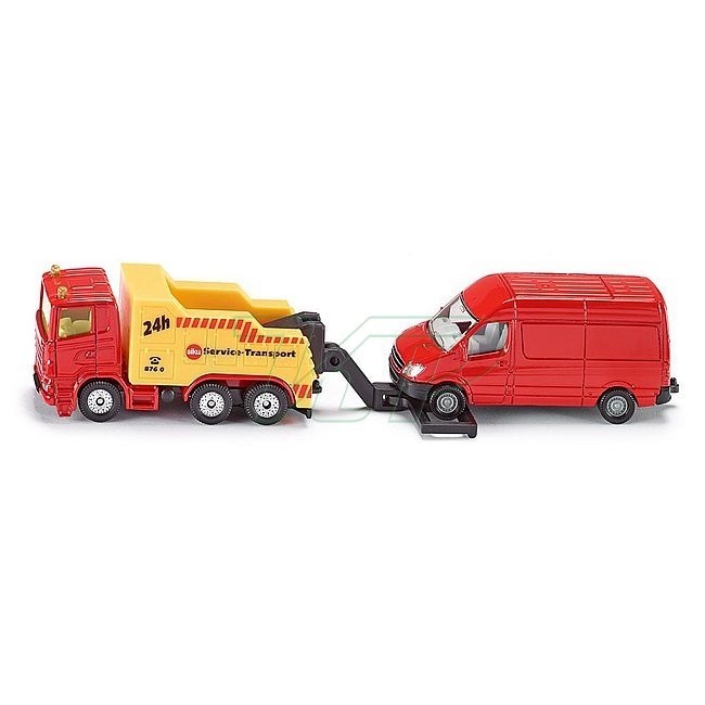 SIKU MAN Odťahovacie auto Mercedes-Benz Sprinter s van modelová sanitka príde na miesto poškodenej dodávky, potom spustí zdvíhacie zariadenie v zadnej časti, potom umiestni dve predné kolesá dodávky do ťažného rámu a zaistí ich