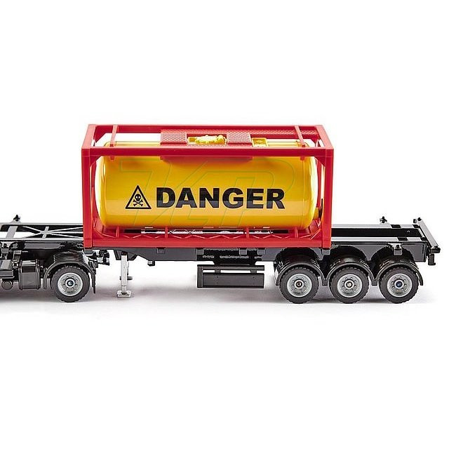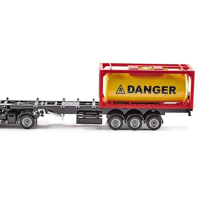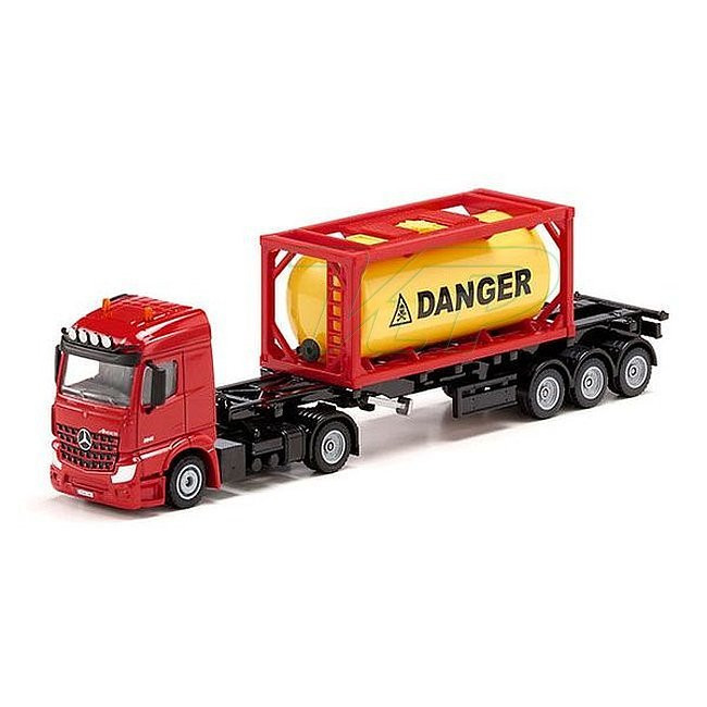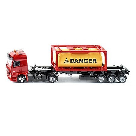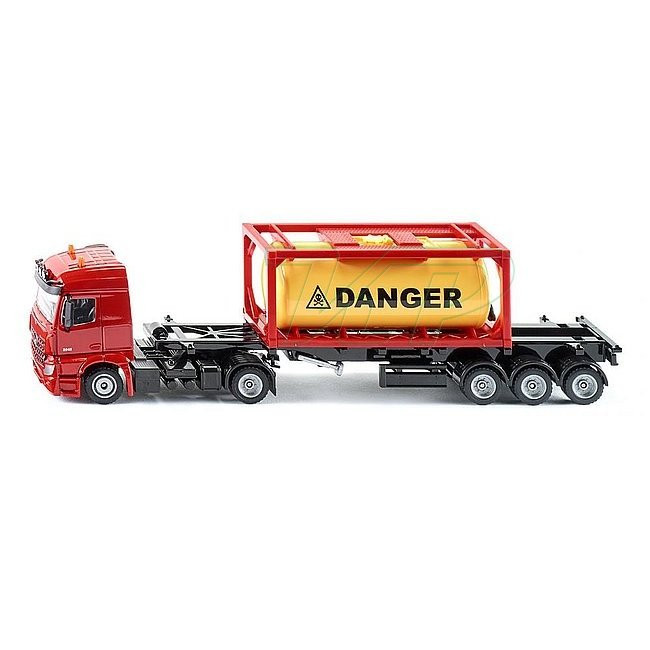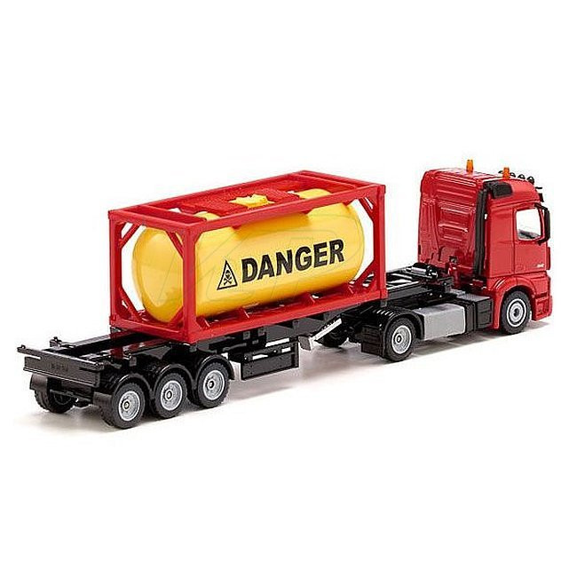 Szállítsd a veszélyes anyag tartályt Mercedes-Benz vontatóval! A SIKU Mercedes-Benz utánfutóval és tartályos konténer rakománnyal vontató teherautó egy piros vontató veszélyes anyag szállító konténerrel