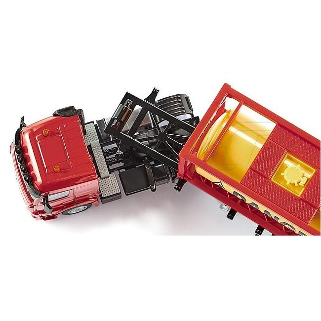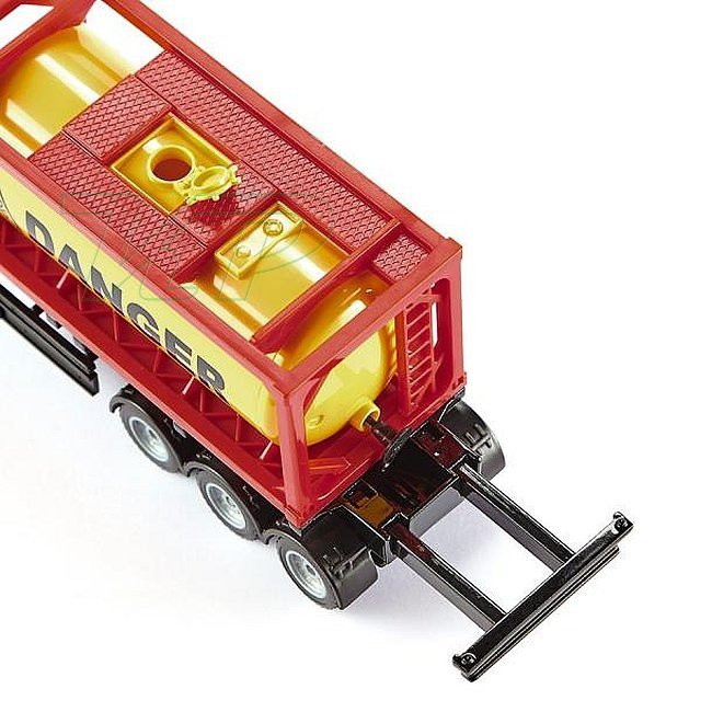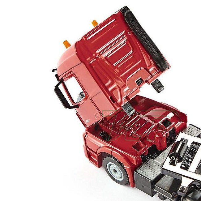 A SIKU Mercedes-Benz utánfutóval és tartályos konténer rakománnyal vontató modell fülkéje billenthető, a tartályos konténer a pótkocsiról levehető, középre vagy akár a hátsó részre is tehető, így egyszerre két konténert is szállíthatsz az utánfutón