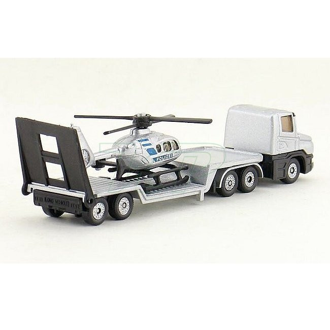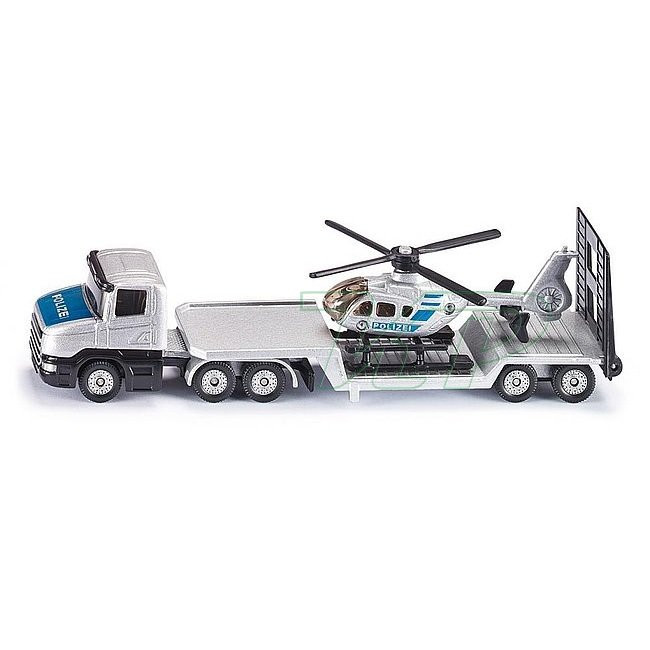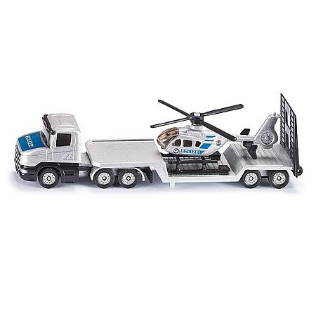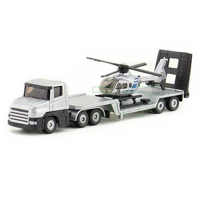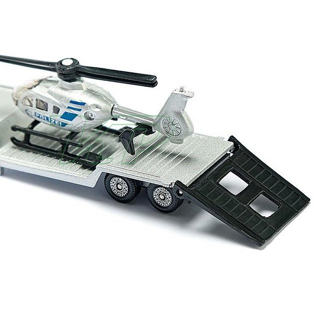 Vytiahnite helikoptéru z hangáru, aby mohla vzlietnuť! SIKU Odťahovka a policajný vrtuľník strieborná odťahovka Scania s prívesom a policajný vrtuľník