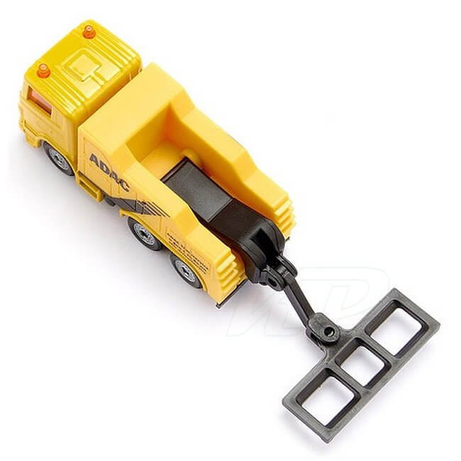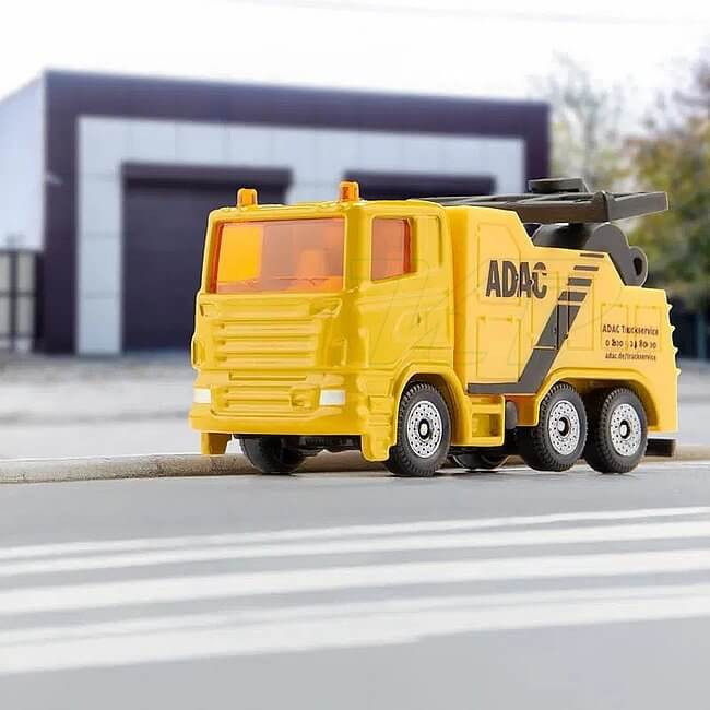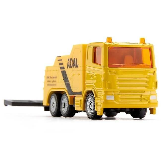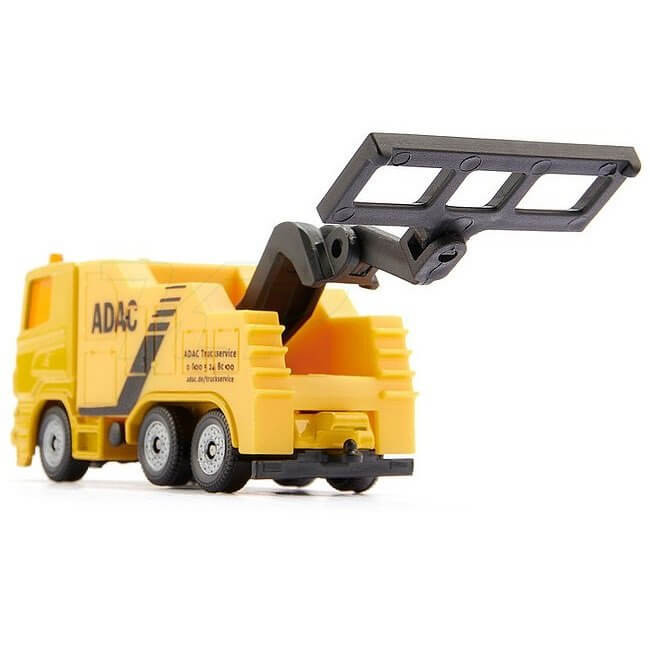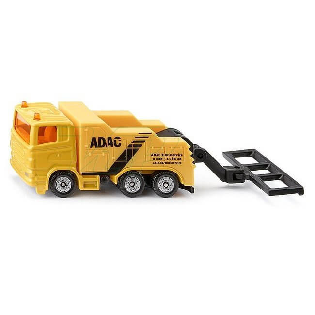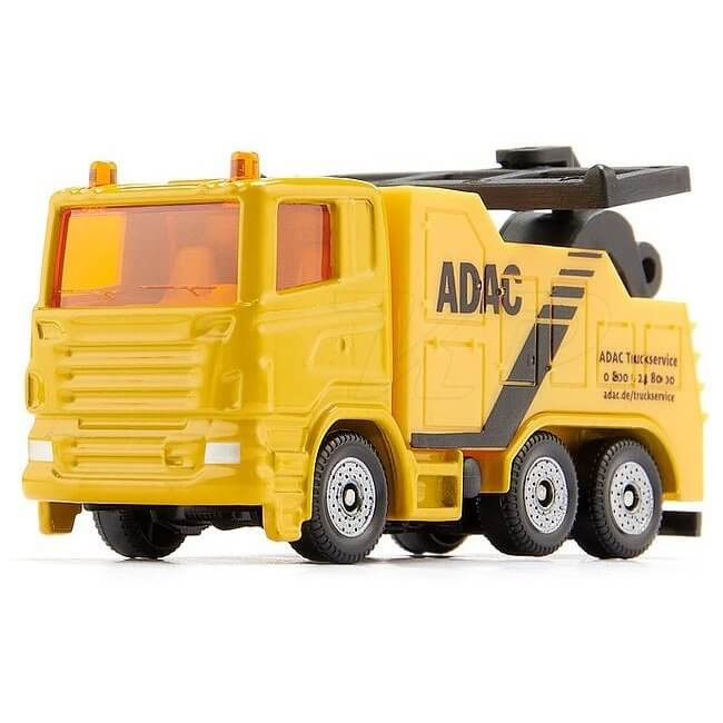 Nechajte si auto odtiahnuť do servisu! SIKU Scania odťahová služba ADAC žlté odťahovacie vozidlo s nápisom ADAC na boku a skladacím zdvihákom vzadu, ktorým môžete odtiahnuť pokazené vozidlo do opravovne