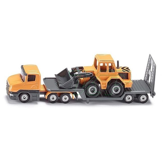 Odvezte čelný nakladač na stavenisko s odťahovkou! SIKU Scania s ťažným prívesom a čelným nakladačom žltá odťahovka s prívesným vozíkom prevážajúcim pracovný stroj