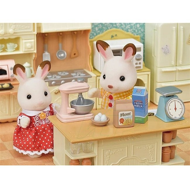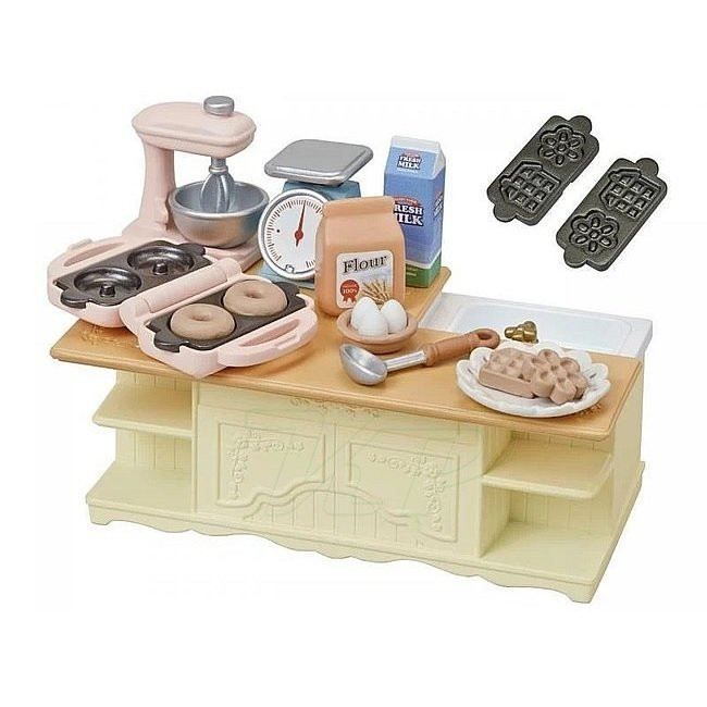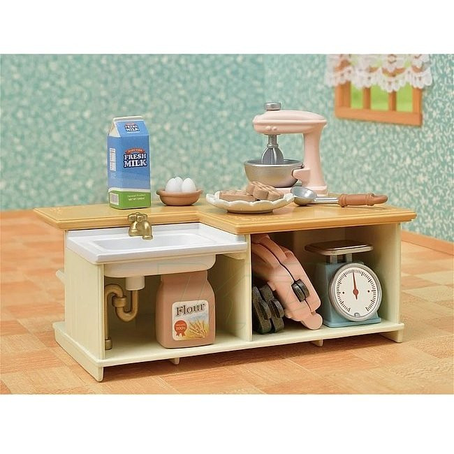 Sylvanian Families Kuchynský ostrov s príslušenstvom obsah: kuchynský ostrovček s drezom, váha, mixér, vaflovač s formičkami, múka, mlieko, vajcia, koláče