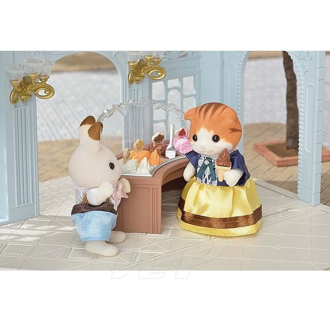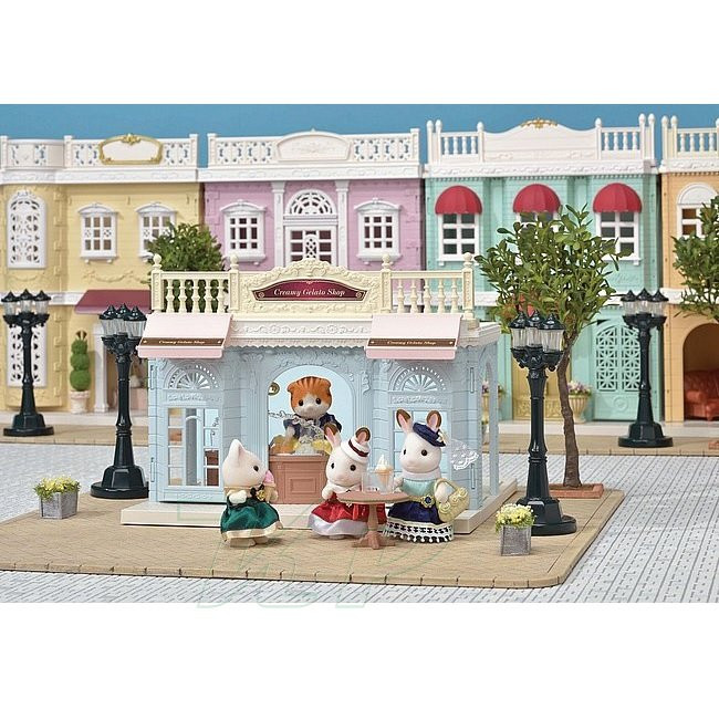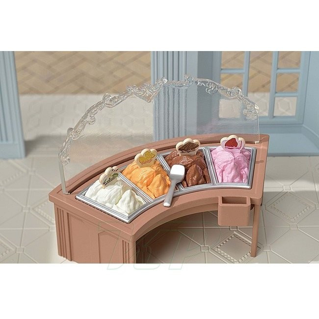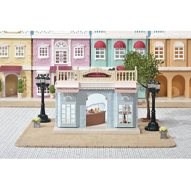 Ochutnajte špeciálne chute mestskej zmrzlinárne! Mestská zmrzlináreň Sylvanian Families je azúrová budova so stenou zdobenou nádhernými štukami, bielym vyrezávaným zábradlím a pozlátenými lampášmi