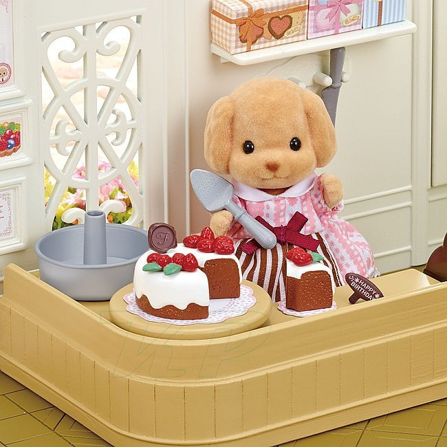 Psík pudlík v súprave na zdobenie torty Sylvanian Families dokáže veľmi šikovne ozdobiť a nakrájať narodeninovú tortu, aby oslávenca prekvapil