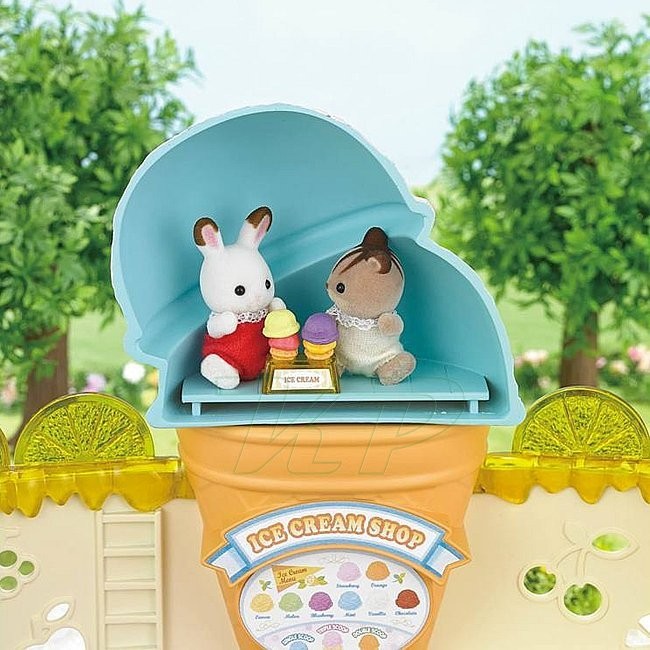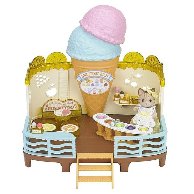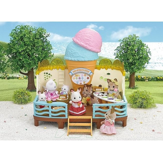 Sylvanian Families Plážová zmrzlináreň má zmrzliny rôznych príchutí, ktoré majiteľ ponúka svojim zákazníkom v lieviku a pri sedení pri stole si môže vychutnať lahodnú zmrzlinu